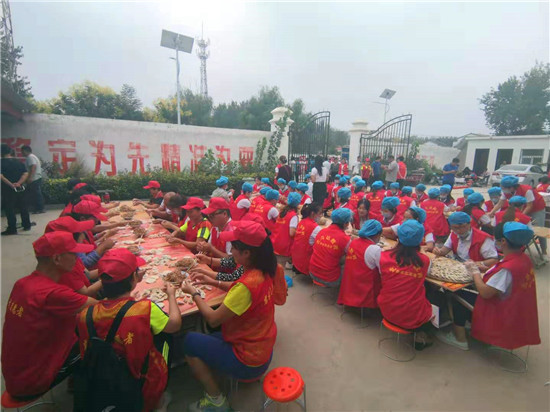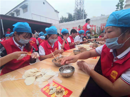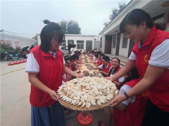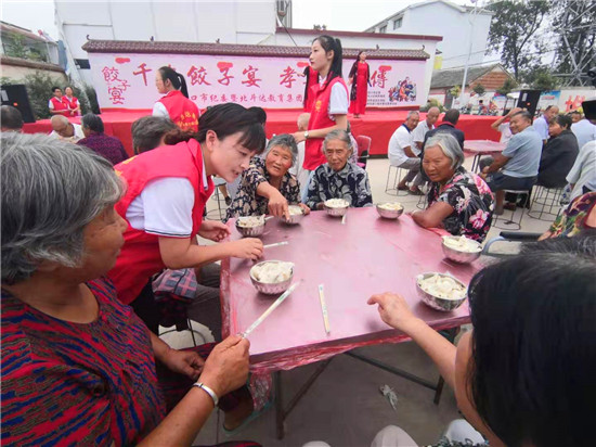 與此同時,在演出現(xiàn)場附近的村委大院內(nèi),由周口市慈孝文化促進(jìn)會、北斗達(dá)教育集團(tuán)等組成的200多名志愿團(tuán)隊正忙得不亦樂乎,調(diào)餡、包餃子、下鍋、端盤,兩個多小時內(nèi),他們精心包出20000多個愛心水餃。11時30分,餃子宴正式開始,老人們一邊吃著水餃一邊觀看者演出,喜笑顏開,呈現(xiàn)出一片相親相敬的溫馨畫面。