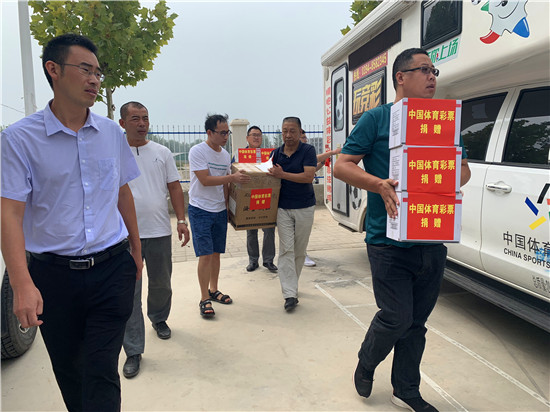 在李菜園學(xué)校,體彩周口分中心工作人員將書包、作業(yè)本、文具盒等學(xué)生用品交接給校長朱長敏,通過他向全體學(xué)生和一線教職工表達了節(jié)日的慰問。