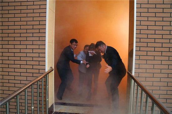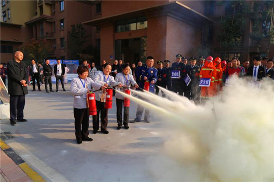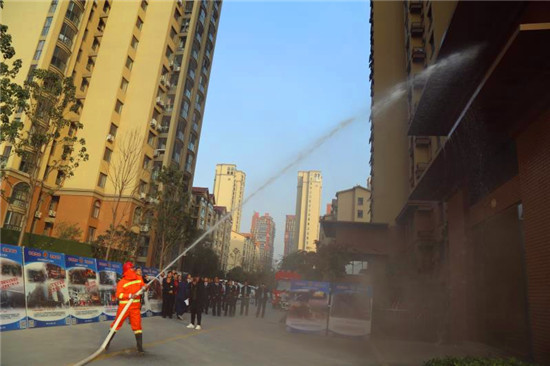 記者在現(xiàn)場看到,隨著消防警鈴的響起、煙霧的彌漫,來自物業(yè)公司和社區(qū)的數(shù)十名群眾彎著腰,同時(shí)用濕毛巾捂著口鼻,緊急而有序地從步梯撤出,與此同時(shí),消防隊(duì)員迅速將消防水袋和槍頭同消防栓相連接,并打開消防栓對(duì)準(zhǔn)“火勢”,一瞬間,發(fā)生在建業(yè)社區(qū)的一場“火災(zāi)”被及時(shí)撲滅,現(xiàn)場圍觀的眾人爆發(fā)出陣陣掌聲。