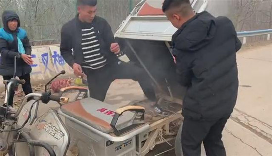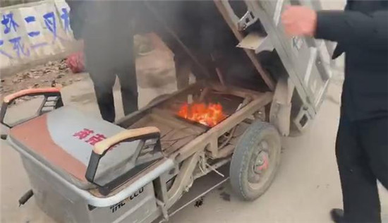 淮陽(yáng):三輪車突然短路起火 消防隊(duì)員手捧泥土滅火