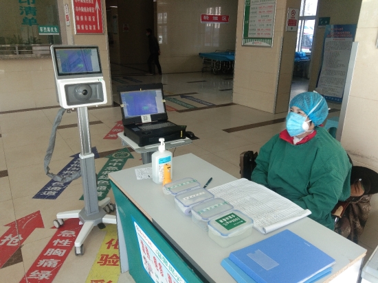 2月18日,記者在周口市中心醫(yī)院急診科看到,一臺醫(yī)用紅外熱像儀出現(xiàn)在急診科的大門口,前來就診的患者必須通過該熱像儀的檢測才能進入急診科就診?!扒皝砭驮\的患者只需要在熱像儀前經(jīng)過,熱像儀就會在屏幕上自動顯示患者的體溫信息,一旦出現(xiàn)體溫偏高的人,熱像儀就會自動報警,并不需要人工檢測,提高了檢測效率。”在該熱像儀前做紀(jì)錄的醫(yī)務(wù)工作者說。 記者 張洪濤 攝