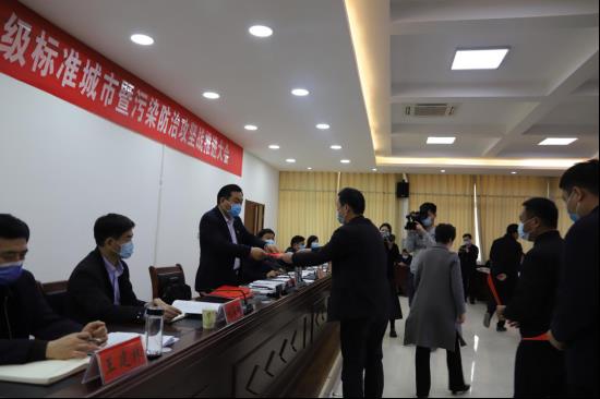 城關(guān)鎮(zhèn)、縣城管局、縣市場(chǎng)監(jiān)管局3家單位主要負(fù)責(zé)人和縣1家城市保潔公司,圍繞創(chuàng)建國(guó)家空氣質(zhì)量二級(jí)標(biāo)準(zhǔn)城市工作相繼作表態(tài)發(fā)言。各鄉(xiāng)鎮(zhèn)黨委書記分別向縣委書記王國(guó)璽遞交創(chuàng)建保證書。