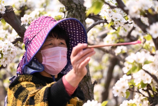 泛區(qū)農(nóng)場的萬畝果園不僅吸引著游客觀光游覽,而且盛產(chǎn)的桃、梨、蘋果,品質(zhì)好,味道好,吸引著商家訂購,為果農(nóng)帶來可觀的經(jīng)濟收入。目前,給梨花授粉是果農(nóng)在花期中最重要的工作,上圖為果農(nóng)正緊張地給梨花授粉。