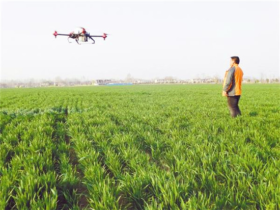 3月24日,在沈丘縣周營鎮(zhèn)平安農(nóng)業(yè)種植合作社訂單優(yōu)質(zhì)小麥種植基地,身穿“黃馬甲”的小麥飛防技術(shù)員正操作無人機,進(jìn)行“一噴多防”病蟲害防治,為夏糧豐產(chǎn)豐收奠定基礎(chǔ)。謝辛凌 攝