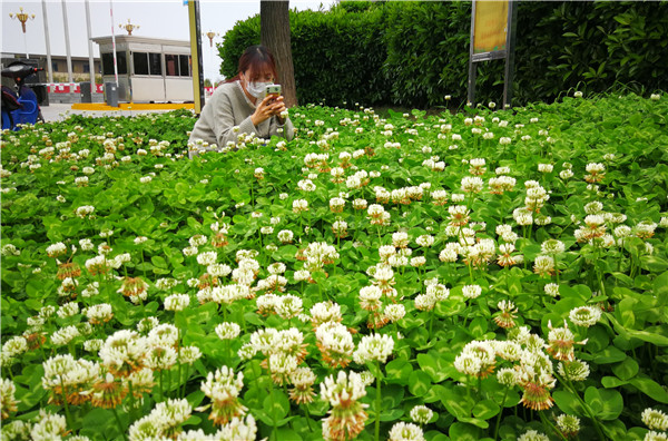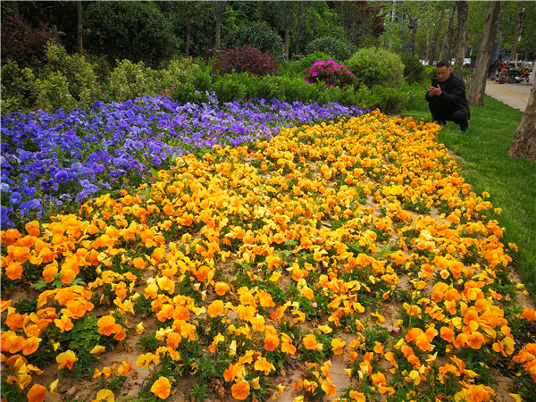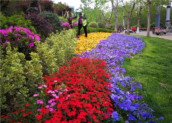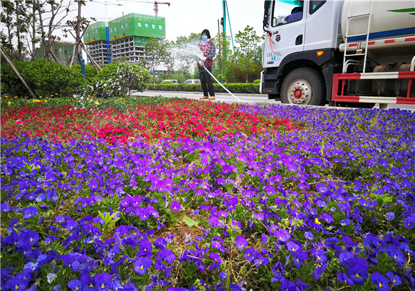 4月20日,在文昌大道道路綠化帶上,市政工人正在為栽種的花卉綠植補充水分。入春以來,我市城區(qū)一直在進(jìn)行美化綠化,現(xiàn)在各個街道逐漸顯現(xiàn)出絢麗身姿。市民走在市區(qū)的每個街道都能看到各色花卉、綠植,很是養(yǎng)眼。