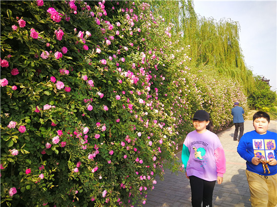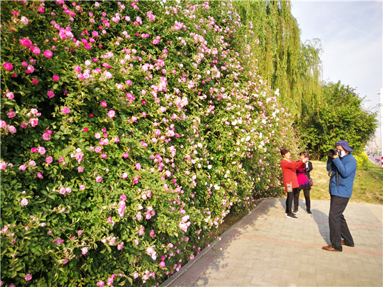 4月23日,市民從繁花滿枝狀如“瀑布”的刺玫花下走過。市體育館西南角的刺玫花正在熱烈綻放,團(tuán)團(tuán)簇簇綴滿枝頭,遠(yuǎn)遠(yuǎn)望去,宛如彩色的“瀑布”一瀉而下。不少市民在花墻前拍照、玩耍,成為市民們“打卡”地。