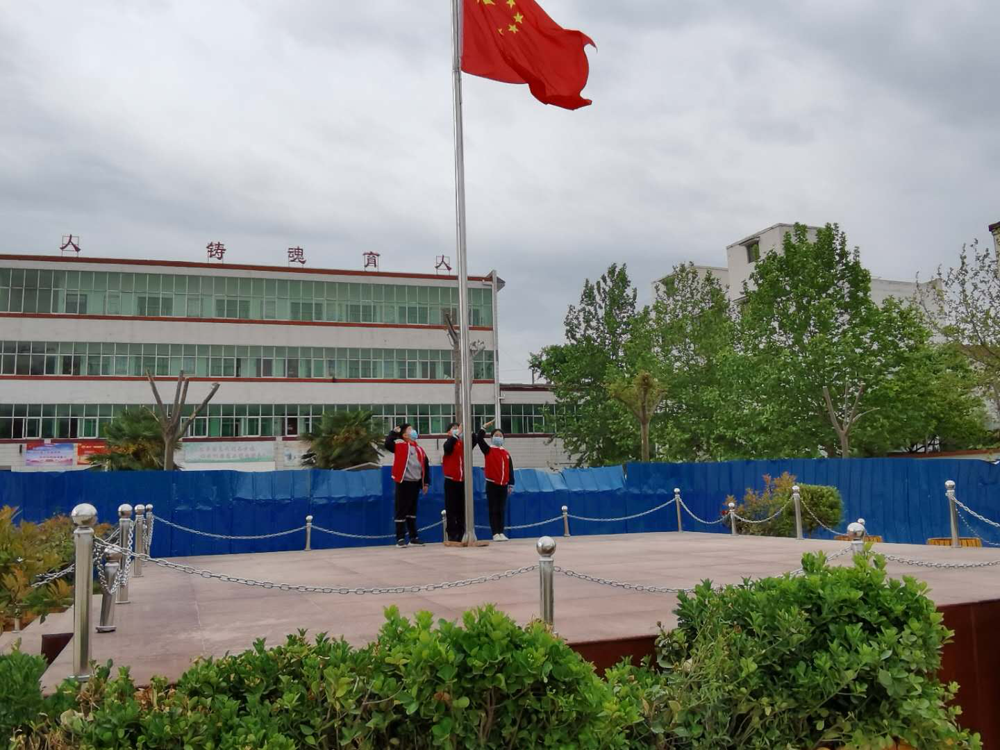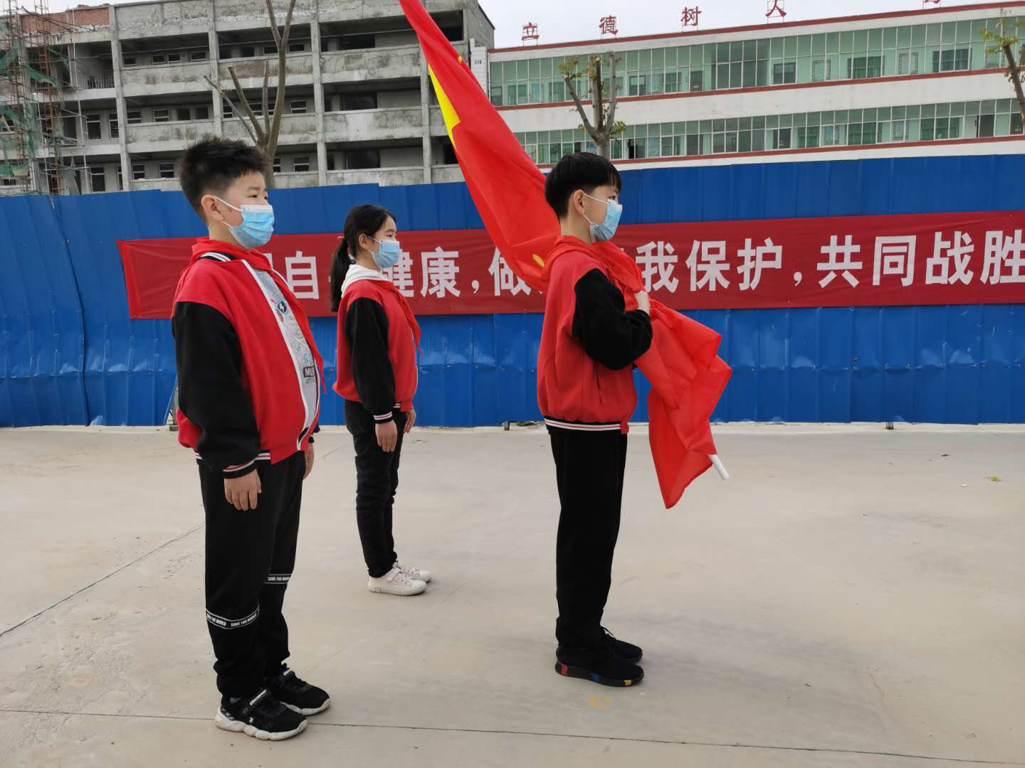 這是一次特殊的升國旗儀式,三名國旗手在操場上將五星紅旗冉冉升起,升旗實(shí)況同步轉(zhuǎn)播到教室內(nèi)的電視屏幕上,同學(xué)們在各自教室里面向國旗莊嚴(yán)肅立、齊唱國歌,面向國旗敬禮,在國旗下立下一個志,將來成為一個對社會有貢獻(xiàn)的人,能夠?yàn)樯鐣龀鐾怀龀煽兊娜恕?nbsp;
