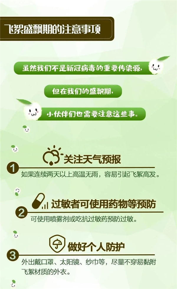 1.無論是防控病毒,還是防護楊柳飛絮等花粉過敏原,現(xiàn)階段都鼓勵外出時佩戴口罩。一次性醫(yī)用口罩即可起到防護作用;外出時盡量不穿易黏附飛絮材質(zhì)的外衣。
