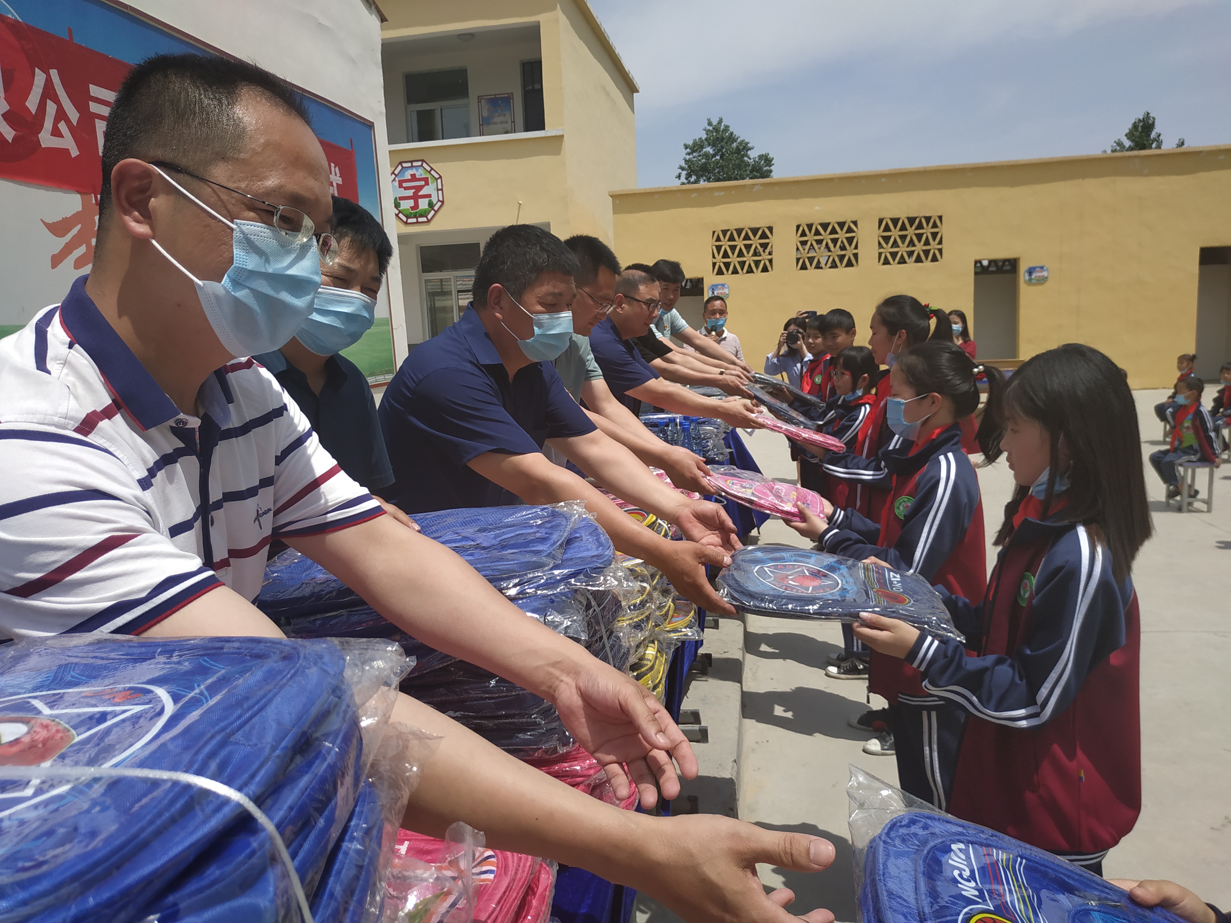 5月21日,河南同和堂醫(yī)藥有限公司與部分周口愛心人士,穿過滾滾麥浪,來到市醫(yī)保局定點扶貧村——項城市新橋鎮(zhèn)北李營行政村,為村小學(xué)的學(xué)生們送去200個書包,向他們提前送上六一兒童節(jié)的祝福。