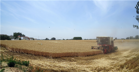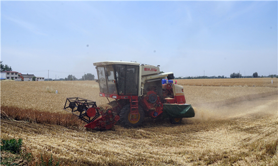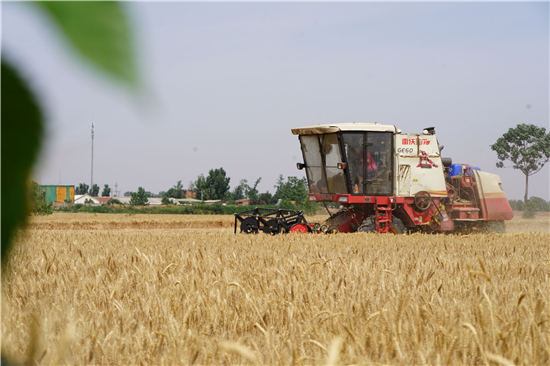 5月28日,在周口市西華縣遲營鄉(xiāng)前喜村,農(nóng)民駕駛收割機(jī)在田間收割小麥。 眼下,周口市近千萬畝小麥陸續(xù)開鐮收割,當(dāng)?shù)剞r(nóng)民搶抓農(nóng)時(shí)收割小麥,確保顆粒歸倉。 記者 金月全 攝