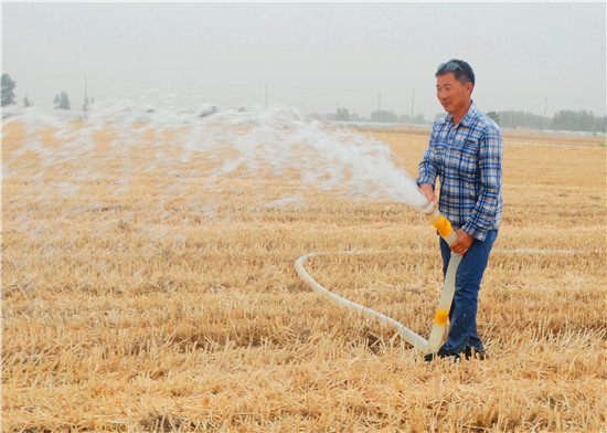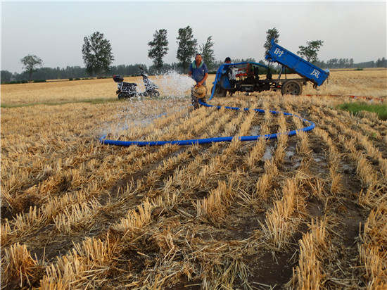 6月6日,沈丘縣周營鎮(zhèn)農(nóng)民正忙著抗旱“造墑”、“補(bǔ)墑”澆水,期待奪取秋糧豐收。 近期來,由于連續(xù)多日高溫?zé)o雨,土壤墑情差,無法播種秋作物。針對(duì)當(dāng)下嚴(yán)重的旱情,沈丘縣掀起“雙抗旱”(抗旱保苗、抗旱種秋)高潮。目前,該縣日出動(dòng)勞力1.8萬余人,出動(dòng)各類噴灌機(jī)械26000多臺(tái)(套),力保農(nóng)田播種的玉米出苗。
