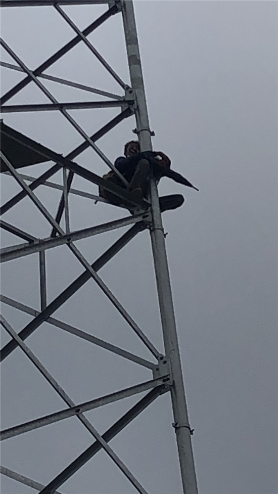 6月18日上午8時(shí)19分,付井鎮(zhèn)派出所值班民警趙良,韓高峰接到報(bào)警電話,一名山東省滕州籍男子因?yàn)楦星槊茉谳爡^(qū)高鐵附近一信號(hào)塔上準(zhǔn)備自殺。值班民警向所長(zhǎng)陳劍鵬匯報(bào)后,陳劍鵬立即帶領(lǐng)民警霍玉亮、韓高峰以及輔警楊國(guó)強(qiáng)、孫海紅、王初中、范紅偉等人迅速趕到現(xiàn)場(chǎng)。