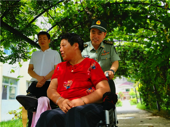 走進(jìn)位于太昊路上的周口市老年護(hù)理院,院內(nèi)整潔有序、花蕊吐香鳥鳴聲聲,小徑通幽處的涼亭內(nèi)三五老人打牌、聊天,一副愜意安詳?shù)纳顖?chǎng)景。在侯國(guó)領(lǐng)母親王玉勤居住的房間內(nèi),李揚(yáng)、孫光濤等人坐在床邊與她聊天談心,看到這么多人來慰問她,王玉勤眼中流下了感動(dòng)的眼淚,她對(duì)慰問人員表示感謝,說自己來護(hù)理院近一年來,吃住條件都不錯(cuò),護(hù)理院照顧的無(wú)微不至,身體一天天恢復(fù),閑暇時(shí)還能不依賴輪椅自己走上一段路。她激動(dòng)地說:“感謝黨和政府的親切關(guān)懷,我最大的愿望是希望倆兒子永遠(yuǎn)聽黨的話,在部隊(duì)安心服役、再立新功,用優(yōu)異的成績(jī)回報(bào)黨和政府對(duì)我們?nèi)业年P(guān)愛?!?/p>