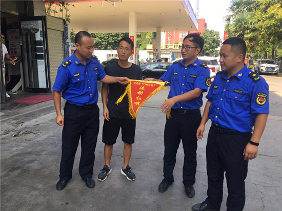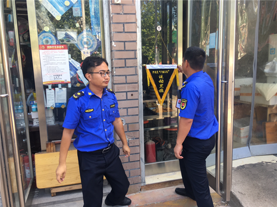 夏日的陽(yáng)光透過(guò)清澈的天空照下來(lái),街很凈,樹(shù)很綠。8月18日是開(kāi)發(fā)區(qū)城管稽查大隊(duì)進(jìn)行“門(mén)前三包”流動(dòng)紅旗和流動(dòng)黑旗評(píng)選的日子。開(kāi)發(fā)區(qū)城管稽查大隊(duì)工作人員根據(jù)綜合評(píng)比標(biāo)準(zhǔn),分別為“門(mén)前三包”工作突出的門(mén)店懸掛流動(dòng)紅旗,為“門(mén)前三包”工作不力的門(mén)店懸掛黑旗。