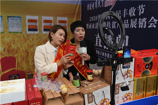 9月22日,兩名“網(wǎng)紅”在商水縣中國農(nóng)民豐收節(jié)暨商水縣消費扶貧產(chǎn)品展銷會上進行直播銷售。近年來,商水縣大力發(fā)展電商扶貧,出臺政策,幫助農(nóng)民通過網(wǎng)絡直播等手段把本地的豬蹄、咸鴨蛋、牛肉、變蛋、黑色五谷等特色農(nóng)產(chǎn)品銷往全國各地,打開農(nóng)產(chǎn)品銷售新渠道,為農(nóng)民脫貧致富奔小康增添新動能。