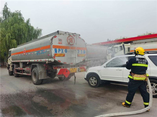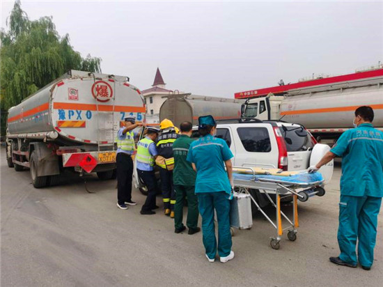 當(dāng)日上午10時(shí),商水交警大隊(duì)指揮中心接到報(bào)警:在商水縣興商大道與陳勝大道交叉口西、湯莊油庫處,一輛轎車與一輛?;饭捃囎肺蚕嘧?,正常罐體損壞,?;沸孤镀鸹穑I車駕駛室變形,駕駛?cè)吮焕к噧?nèi),如不及時(shí)救援,駕駛?cè)擞猩kU(xiǎn),另外因事故現(xiàn)場臨近湯莊油庫,如不及時(shí)處置可能發(fā)生爆炸,后果不堪設(shè)想。
