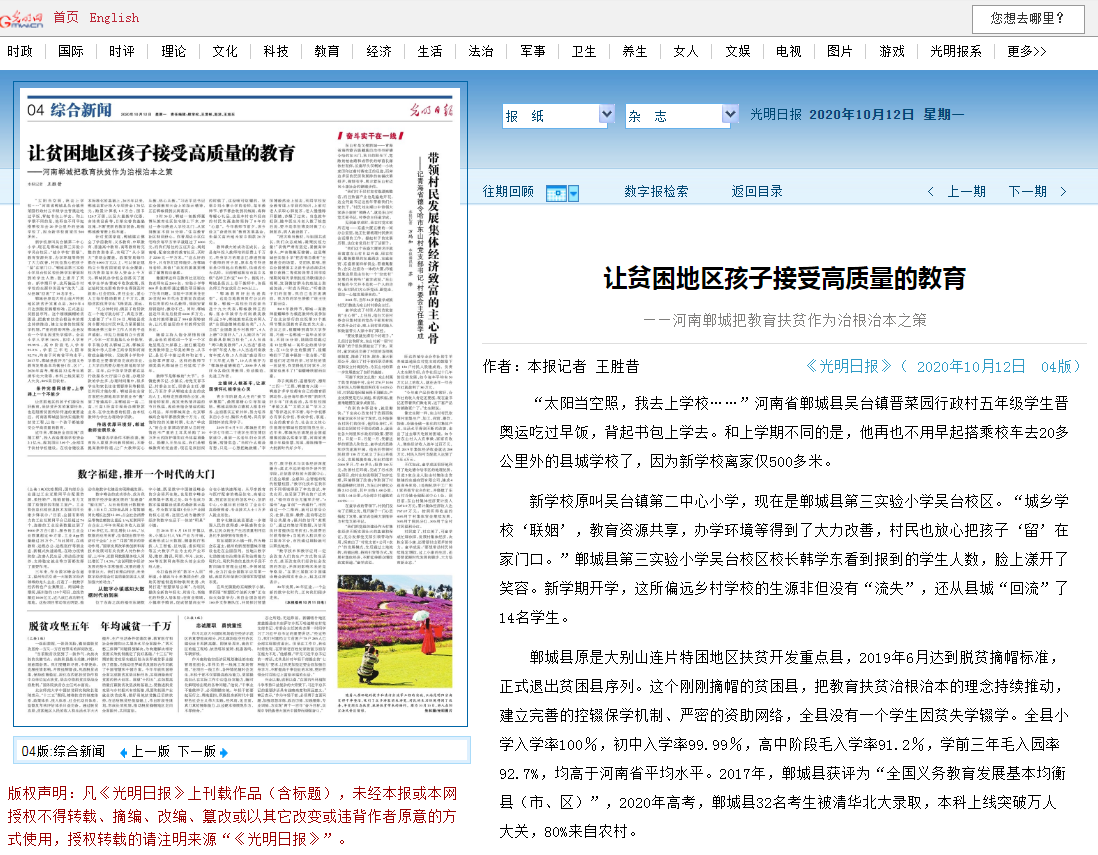 今天(2020年10月12日)出版的《光明日報》綜合新聞版,以頭條顯著位置刊登《讓貧困地區(qū)孩子接受高質量的教育——河南鄲城把教育扶貧作為治根治本之策》,對鄲城教育成果進行了詳細而深入的報道,這里全文轉載,以饗讀者——