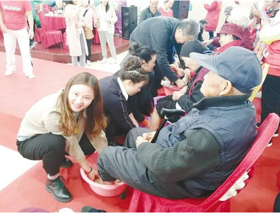 重陽節(jié)當(dāng)天,周口市總工會(huì)、周口市教體局、川匯區(qū)供銷社在鴻運(yùn)酒店舉辦“九九重陽節(jié) 濃濃敬老情”孝老愛親活動(dòng),邀請(qǐng)200多名社區(qū)老年人及家屬參加?;顒?dòng)現(xiàn)場(chǎng),家屬為老人進(jìn)行了洗腳(如圖),主辦方安排了精彩的文藝演出,博得觀眾陣陣掌聲,讓社區(qū)老人過了一個(gè)歡樂祥和的重陽節(jié)。