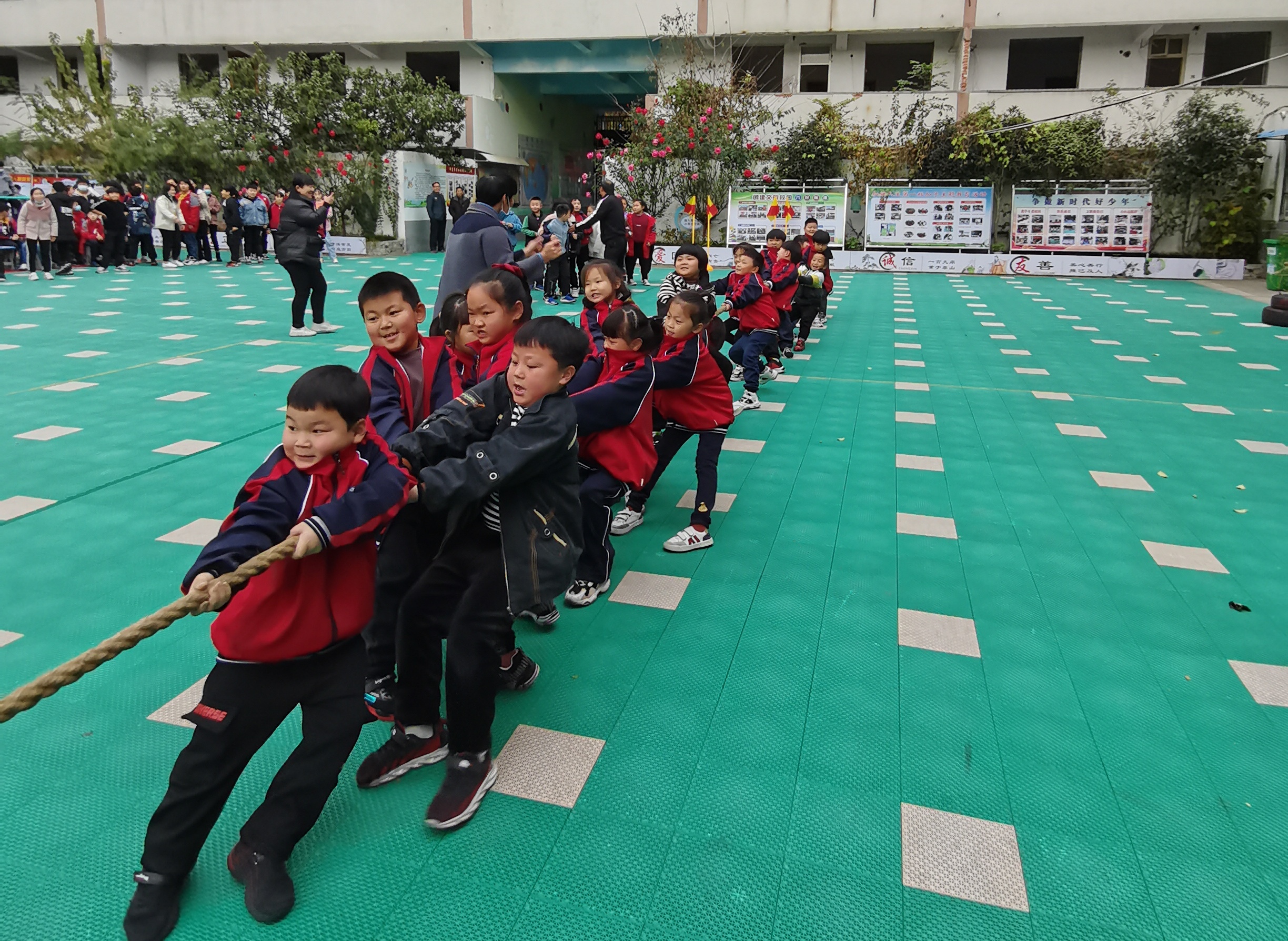 “加油、加油”在此起彼伏的歡呼和加油聲中,拔河比賽開始啦!同學(xué)們?cè)诳朔щy、順利完成比賽后體會(huì)到發(fā)自內(nèi)心的勝利感和自豪感,獲得人生難得的團(tuán)隊(duì)體驗(yàn)。小運(yùn)動(dòng)員們做到“勝不驕,敗不餒”,充分展示了川匯區(qū)青少年學(xué)生昂揚(yáng)向上的精神風(fēng)貌。