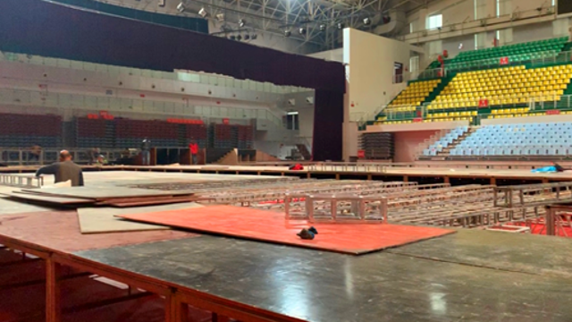 11月23日上午,記者在周口市體育中心看到,由國際名模馬艷麗領(lǐng)銜的周商大會(huì)國際時(shí)裝表演秀的舞臺(tái)正在搭建中。