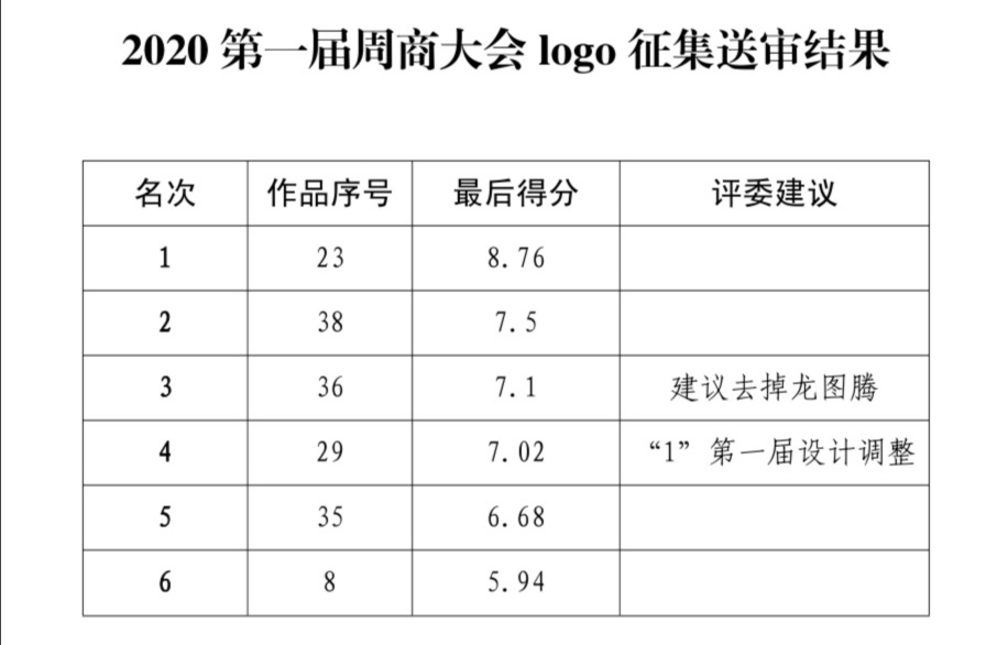 自11月12日起面向社會(huì)公開征集第一屆周商大會(huì)主題會(huì)標(biāo),截至11月19日24:00時(shí),大會(huì)工作組共征集到來自10個(gè)省轄市的作品67件。11月20日上午10:00時(shí),對(duì)作品進(jìn)行統(tǒng)一編號(hào)后,經(jīng)專家評(píng)審團(tuán)評(píng)審出55幅進(jìn)入評(píng)選,經(jīng)逐項(xiàng)打分初評(píng)出6件作品,最后按綜合得分前三名作品入圍。