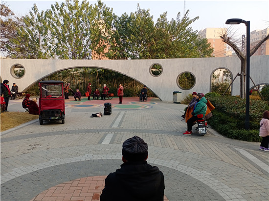 12月10日,雖然氣溫不高,可是天空暖陽高照,在周口中心城區(qū)建安路上的一個(gè)街頭游園內(nèi),不僅聚集了前來休閑的老人,還有不少戲迷朋友,她們手拿話筒,唱起戲曲節(jié)目,讓人樂在其中。記者 張洪濤 攝