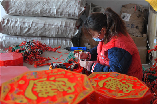 12月14日,記者在一帆工藝制作工廠內(nèi)看到,二十多名村民在各自的工作崗位上有條不紊地忙碌著。簡易焊接、測試組裝、安裝炮串……一串串喜慶的電子鞭炮組成裝箱,賀潘海正在指揮工作人員裝車,現(xiàn)場一派繁忙的景象。