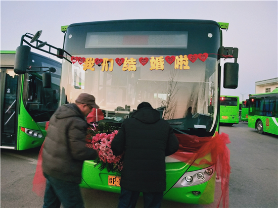 “這個想法是我和我媳婦一起商量出來的。我們覺得別人結(jié)婚都是用婚車,有點千篇一律。我們作為公交人就想另辟蹊徑,用我們公司的公交車當婚車,同時也倡導綠色出行,還很有紀念意義?!?新郎買亞飛告訴記者。
