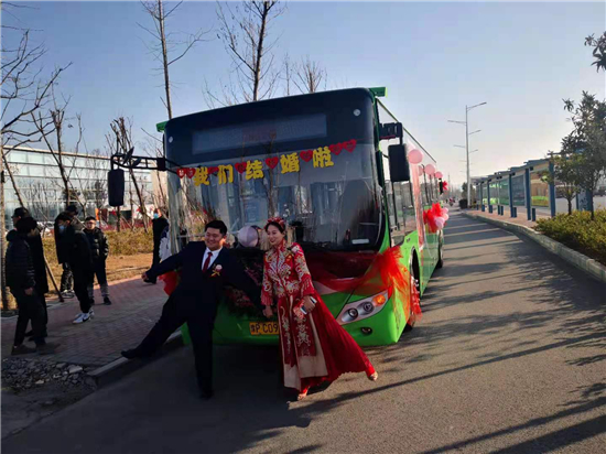 1月1日早上,裝飾一新的6輛迎親公交車吸引了眾人的目光。周口公交一公司19路公交車司機、新郎買亞飛用公交車,迎娶同為公交車司機的新娘裴丹陽,被當作婚車的公交車為新能源車,正是新郎和新娘平時駕駛的19路和9路公交車,以及15路公交車。整個婚禮,親朋好友都是乘坐公交車趕往婚禮現(xiàn)場,環(huán)保又有新意。