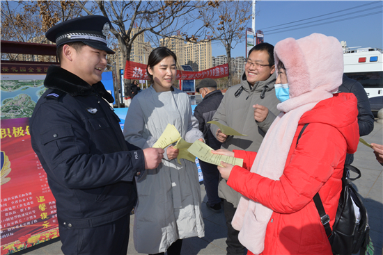 為迎接第35個(gè)“110宣傳日”的到來,1月9日,扶溝縣公安局組織民警在人民公園廣場開展“一心為民110,砥礪奮進(jìn)新征程”為主題宣傳活動(dòng)。民警通過現(xiàn)場發(fā)放宣傳資料、法律宣傳、警民互動(dòng)等方式介紹110社會(huì)聯(lián)動(dòng)常識(shí),教群眾如何提升冬季安全防范知識(shí),進(jìn)一步密切警民關(guān)系。圖為民警向過往群眾發(fā)放宣傳資料。