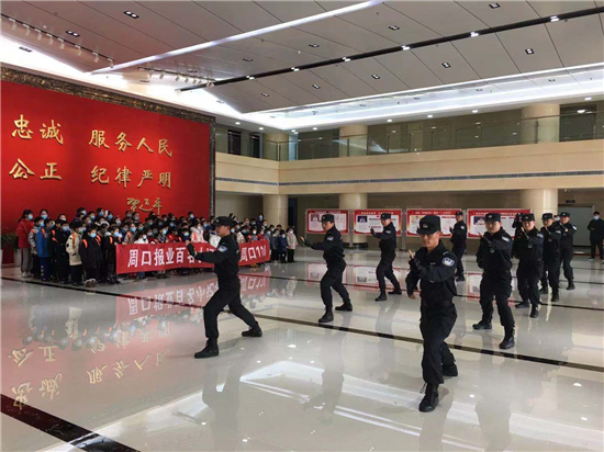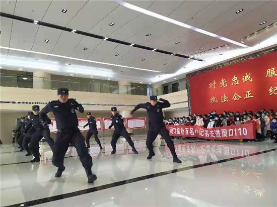 1月10日是首個(gè)“中國人民警察節(jié)”和“110”誕生35周年。小記者應(yīng)邀提前走進(jìn)市公安局參觀體驗(yàn)。9日上午,在二樓大廳,特警隊(duì)員進(jìn)行了擒敵拳表演,現(xiàn)場(chǎng)掌聲經(jīng)久不息。