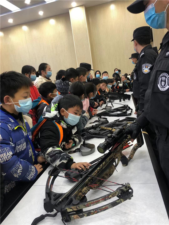 在指揮中心大廳,小記者們還有序參觀了現(xiàn)場(chǎng)展示的特殊警用裝備。除了手槍外,還有沖鋒槍、狙擊步槍、激光炫目槍和強(qiáng)力弓弩等。市公安局特警支隊(duì)民警向小記者們介紹了各種槍支及裝備的性能和使用方式,并邀請(qǐng)小記者觸摸一把警用槍械。