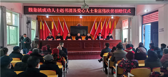 1月29日,天氣乍暖還寒,魏集鎮(zhèn)政府人頭攢動(dòng),喜氣洋洋,一片熱鬧的景象。內(nèi)蒙古希拉穆仁旅游置業(yè)開發(fā)有限公司董事長(zhǎng)、內(nèi)蒙古楊子照明鋼桿制造有限責(zé)任公司董事長(zhǎng)、內(nèi)蒙古周口商會(huì)會(huì)長(zhǎng)趙書清和愛心人士朱富偉一行,帶著整整兩卡車米、面、油共計(jì)八萬(wàn)元生活物資,回到家鄉(xiāng)魏集鎮(zhèn)開展扶貧濟(jì)困活動(dòng),在嚴(yán)寒的冬日給魏集鎮(zhèn)困難群眾帶來了溫暖和祝福??h政協(xié)主席孫培忠,縣委常委、宣傳部長(zhǎng)李本磊出席活動(dòng)。魏集鎮(zhèn)黨委書記衛(wèi)春忙,鎮(zhèn)長(zhǎng)劉艷光參加活動(dòng)。