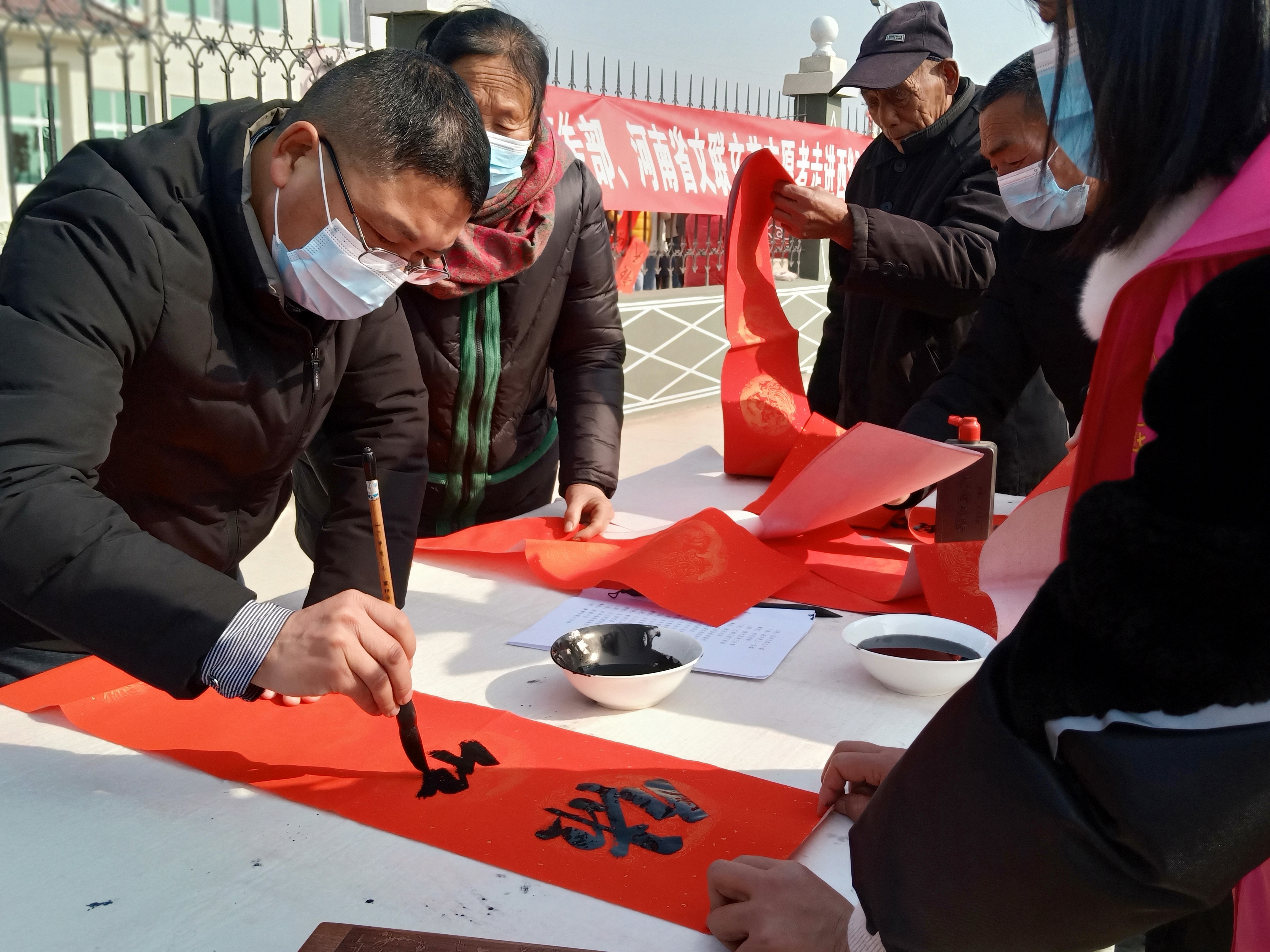 一大早,半截樓村新時(shí)代黨群服務(wù)中心樓前大院里人頭攢動(dòng)、歡聲笑語(yǔ)、翰墨飄香。一邊是省文聯(lián)志愿者義寫(xiě)春聯(lián)送福,一邊是文藝志愿者文藝培訓(xùn)。村民們喜領(lǐng)一副副散發(fā)著墨香的大紅春聯(lián),臉上洋溢著幸福喜悅的笑容。