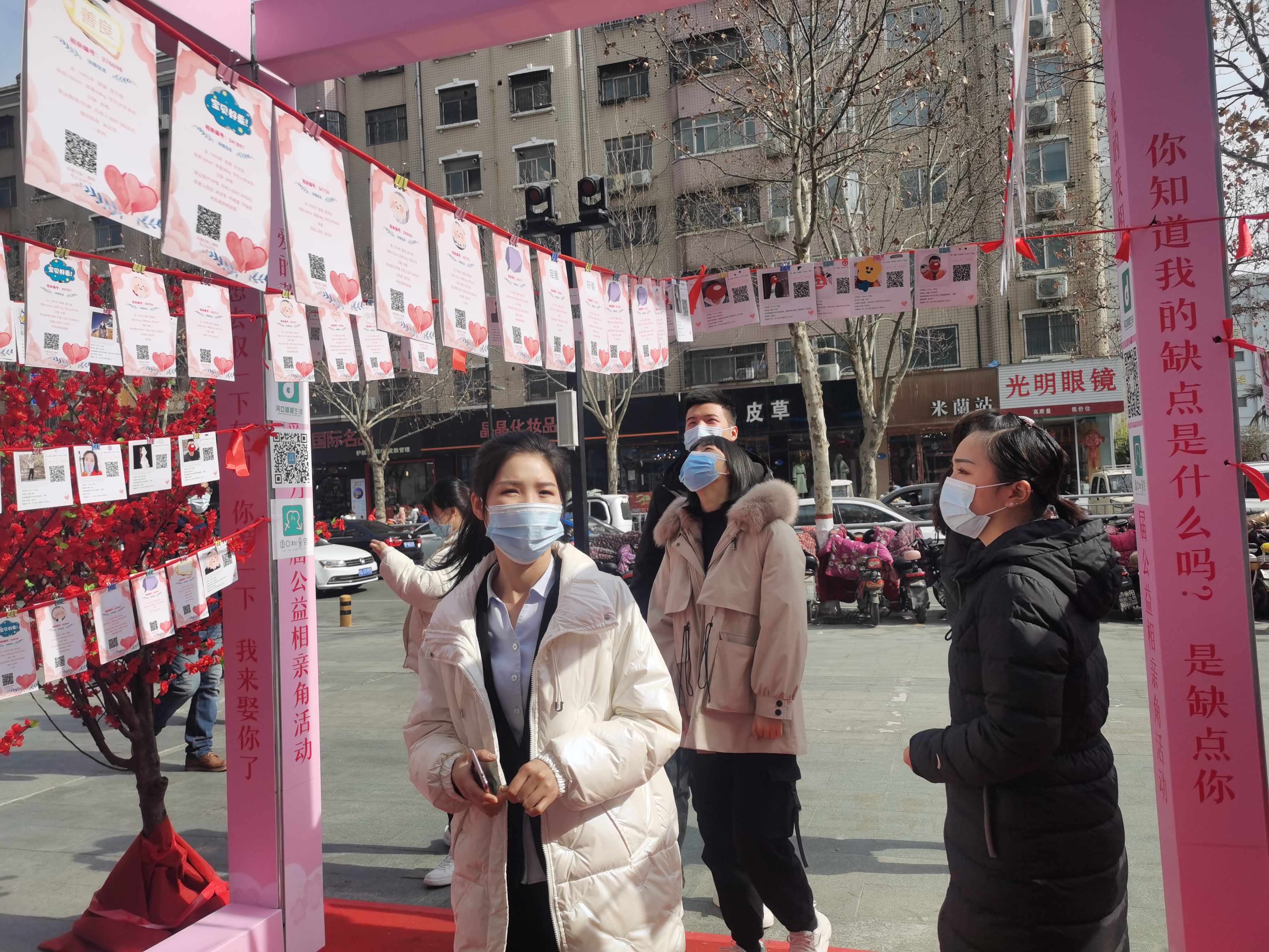 2月6日,不少市民在位于五一路與七一路交叉口的愛(ài)的茂商場(chǎng)門(mén)口的相親角駐足觀看,了解情況。