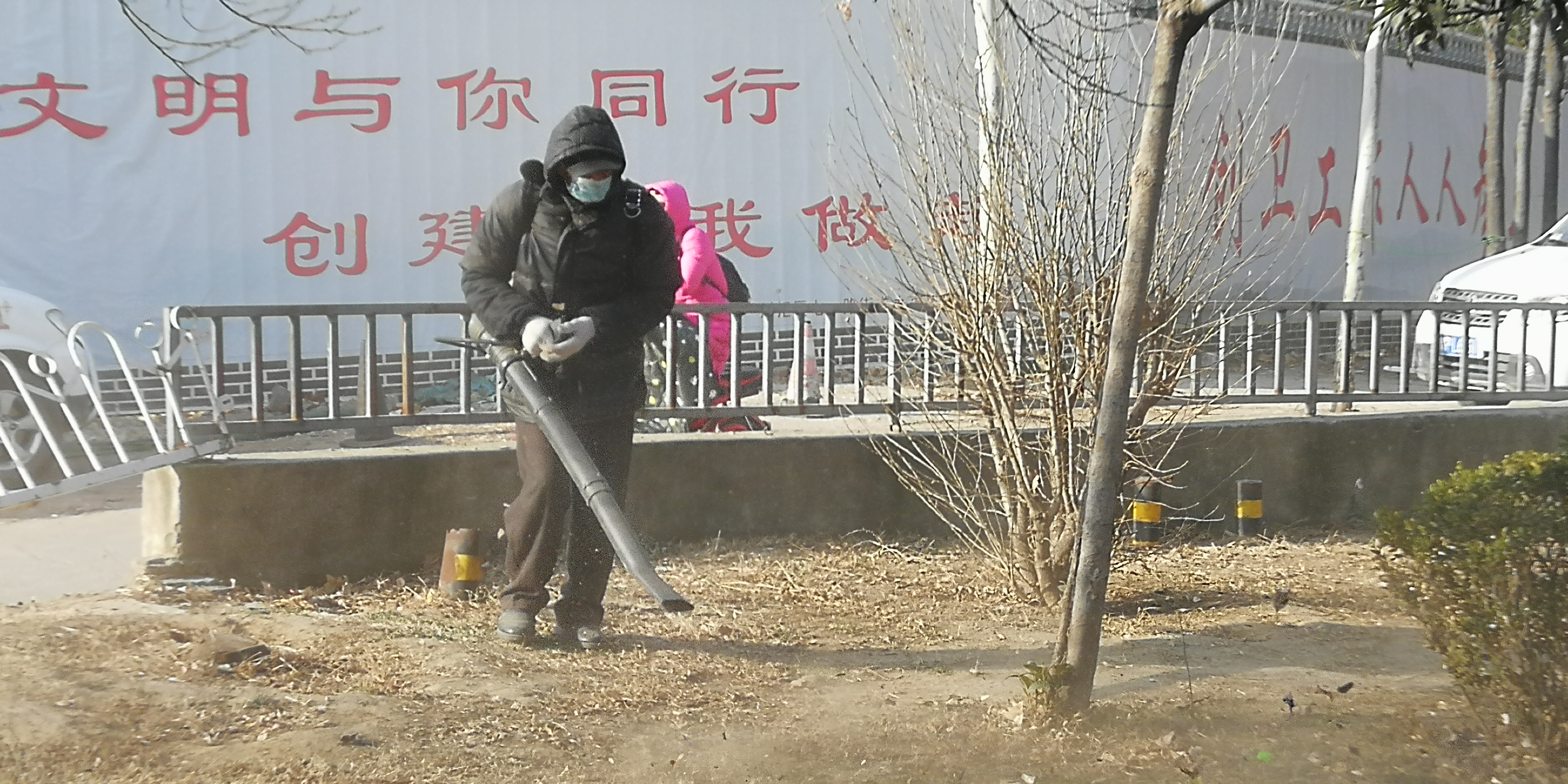 2月11日,大年三十。在川匯區(qū)濱河路上,工作人員背著吹風(fēng)機(jī)清理游園內(nèi)的落葉和垃圾。工作人員介紹,這樣便于更快更好地工作。(周口日?qǐng)?bào)·周道客戶(hù)端記者 馬月紅)②7