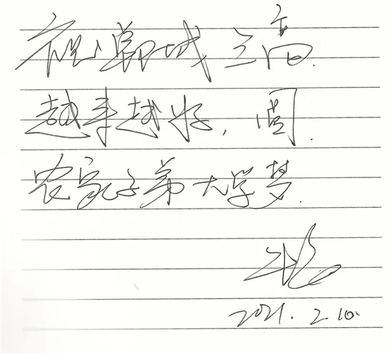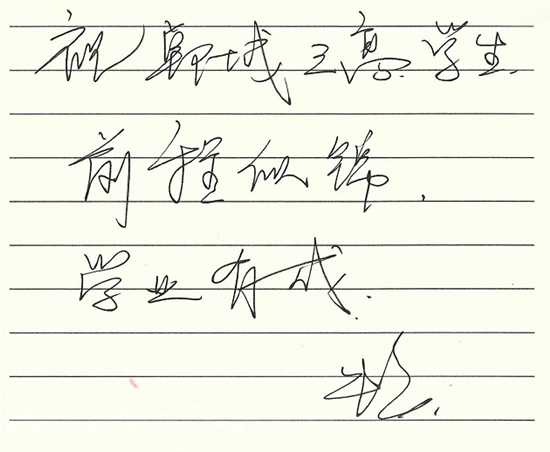 朱婷雖然很少回家,但是一直關(guān)注老家鄲城的發(fā)展變化,特別關(guān)注鄲城的教育發(fā)展,當(dāng)她得知鄲城三高率先提煉出“孝、勤、韌、忠、濟(jì)”為核心的朱婷精神,并把這種精神作為鄲城三高學(xué)子的精神引領(lǐng)時非常感動,為鄲城三高始終堅持立德樹人的教育理念而高興,為鄲城三高學(xué)子的拼搏進(jìn)取精神而欣慰,為鄲城三高辦學(xué)成果而點(diǎn)贊,并欣然寫下:“ 祝鄲城三高越來越好,圓農(nóng)家子弟大學(xué)夢;祝鄲城三高學(xué)生前程似錦,學(xué)業(yè)有成。”