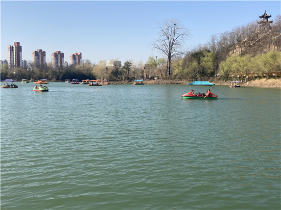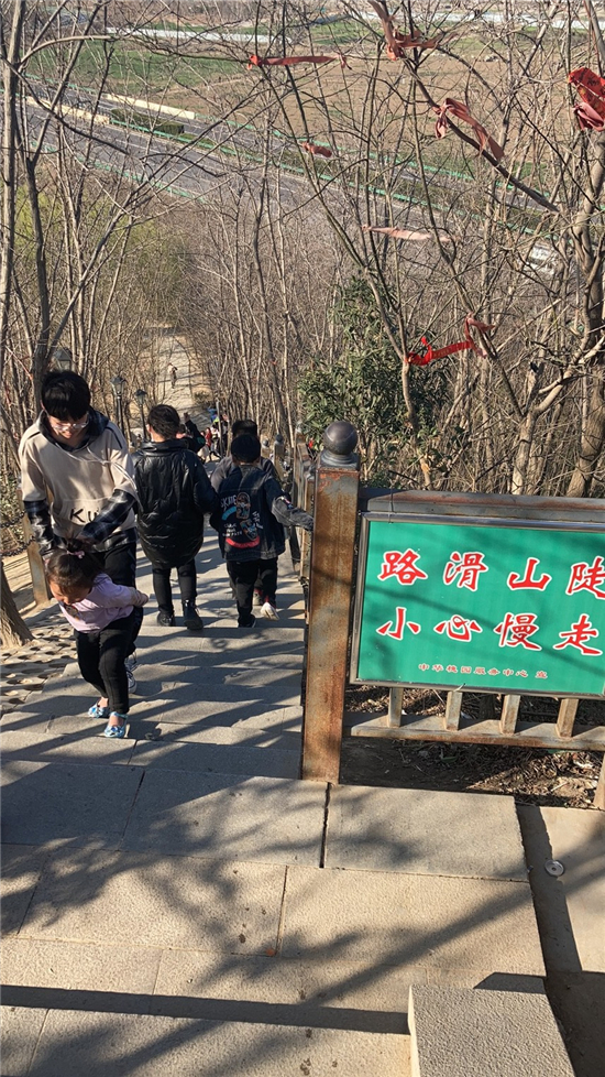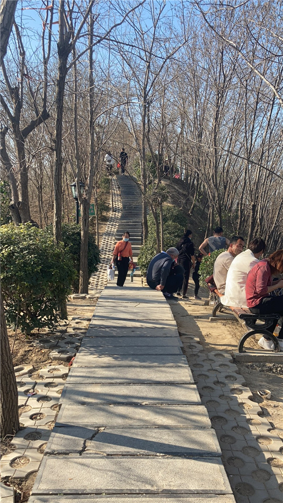 在槐香湖邊,年輕人三五結(jié)伴登上游艇,“坐船能到湖那邊的小島,島上也有槐樹,拍照肯定特別漂亮。”返鄉(xiāng)大學(xué)生把七星島上的景色留在了自己的相機里。七星島與槐香湖相連的橋上,人潮擁擠,有的人席地而坐,觀賞著橋上的風(fēng)景。當(dāng)問道在外市工作的王先生游玩感受時,他回答到:“年后上班沒時間鍛煉身體,今天我把全家人帶來登山,呼吸一下新鮮空氣。”③5