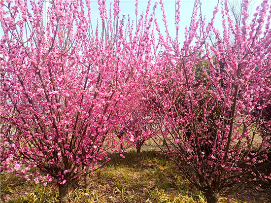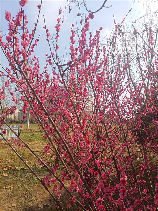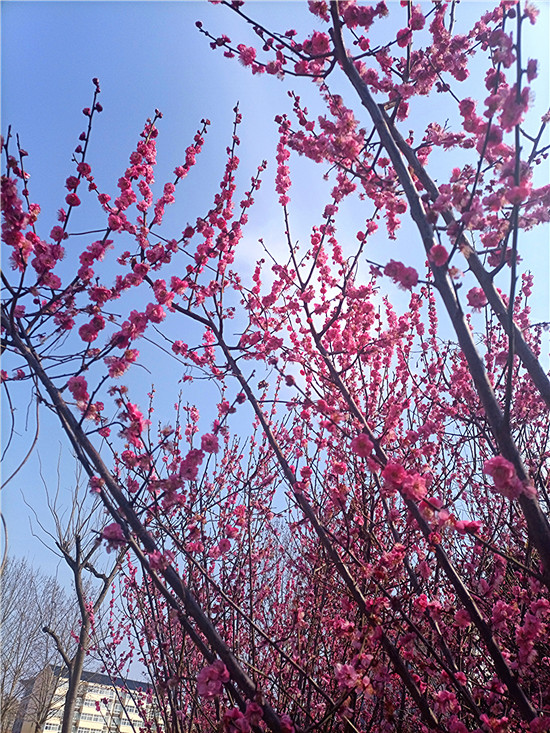 梅花,自古以來就是文人墨客筆下的??汀S性娫疲骸按猴L(fēng)試手先梅蕊,頩姿冷艷明沙水?!泵坊軌蛄韬㈤_,兼具冷艷和嬌媚,被譽為花中四君子之首。近日,我市天氣晴好,公園內(nèi)、道路旁,一樹樹梅花開的熱熱鬧鬧、密密匝匝,令人感受到濃濃的春意和無盡的美好。