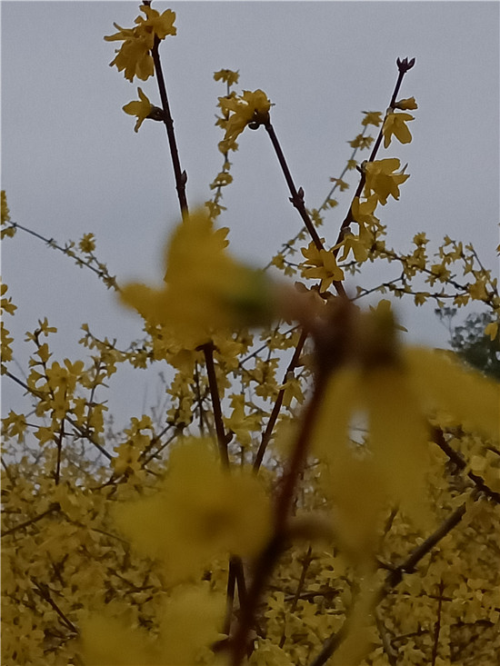 黃色的迎春花似云霞滿天,白色的玉蘭花婀娜多姿,紅色玉蘭含苞待放,即將飄零的臘梅老也留戀枝頭,舍不得離去,鮮艷的百花醉得垂柳在水面上扭起纖細(xì)的枝條。