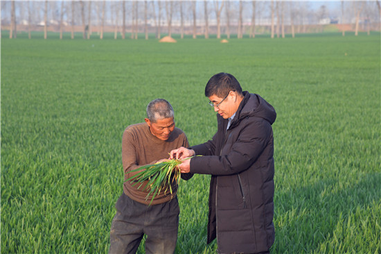 3月3日,商水縣黃寨鎮(zhèn)農技人員在察看小麥長勢。近日,我市普降小到中雨,旱情解除,土壤墑情改善,有利于冬小麥起身返青,為農業(yè)豐收打下基礎。周口日報·周道客戶端記者 付永奇 攝