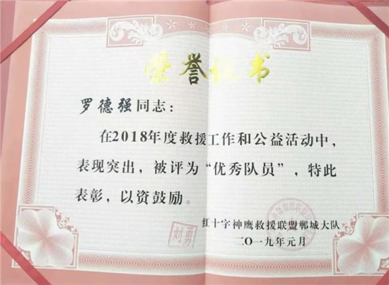 “今年我在公園大塘還救了一名落水群眾,但是由于發(fā)現(xiàn)太晚,已經(jīng)沒(méi)有了生命跡象?!绷_德強(qiáng)說(shuō)起此事總是難過(guò)。羅德強(qiáng)救人的美名越傳越遠(yuǎn),引起了鄲城縣神鷹救援隊(duì)的注意?!傲_德強(qiáng)水性好、熱心腸,救了那么多人卻不留姓名。”