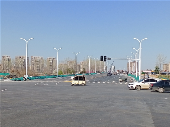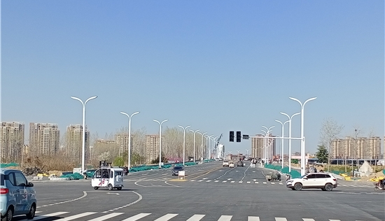圖片說明:3月22日下午,記者在周口市中心城區(qū)中原路跨沙潁河大橋南側(cè)看到,一個個嶄新的路燈桿出現(xiàn)在道路兩側(cè)。藍天白云下,這些路燈桿顯得格外醒目,既扮靚了大橋,又方便了市民出行。
