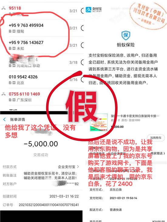 在3個(gè)多小時(shí)的通話里,輕信了騙子的小輝,接連被對(duì)方以需要“退回理賠款”和提供“資金流水證明”為借口,騙取了5000元錢的“樂花卡”網(wǎng)貸、2300元的花唄和999元的個(gè)人賬戶資金。由于是共享屏幕,個(gè)人信息泄露無遺,騙子還登錄了小輝的京東賬號(hào),冒充小輝與客服人員聊天,套取了京東白條2400元錢,用于購買游戲網(wǎng)卡。