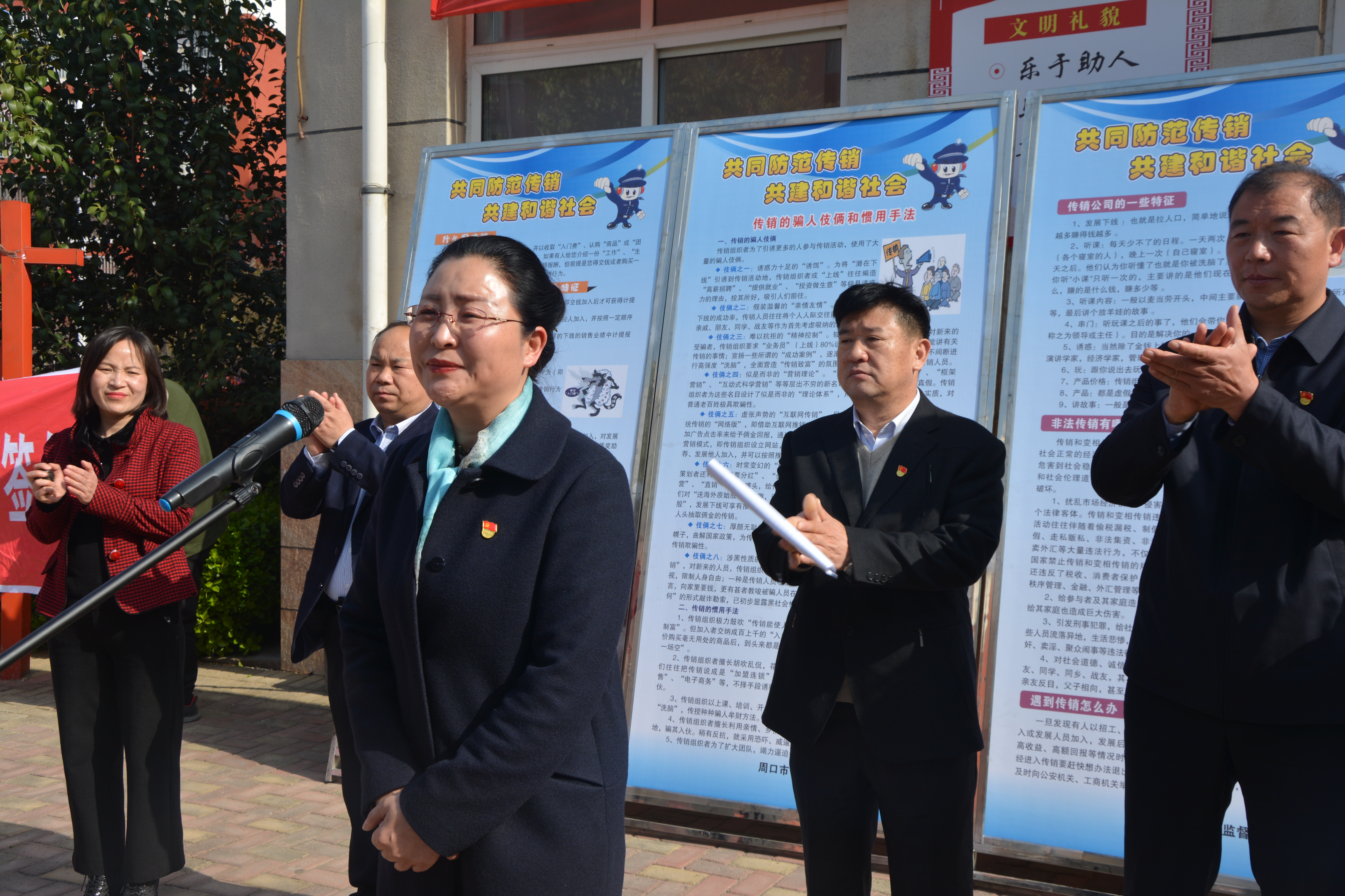 市市場監(jiān)管局二級高級主辦王樹平,港區(qū)打擊傳銷工作領(lǐng)導(dǎo)小組組長、黨委委員、紀(jì)委書記李素芹出席活動,市市場監(jiān)管局公平交易科科長豐亞偉、主任科員孟金鳳,港區(qū)管委會維穩(wěn)創(chuàng)新辦、安全辦、李埠口鄉(xiāng)政府負責(zé)人,周口市公安局港區(qū)分局民警輔警代表、各行政村分管同志、三個小區(qū)物業(yè)公司代表,市場監(jiān)管局港區(qū)分局全體同志,周口日報社等新聞單位以及前來參觀的群眾參加了活動。港區(qū)打擊傳銷工作領(lǐng)導(dǎo)小組辦公室主任、市場監(jiān)管局港區(qū)分局局長崔健作創(chuàng)建動員講話。他指出,嚴(yán)厲打擊傳銷違法行為,增強廣大群眾識別傳銷、抵制傳銷的能力,發(fā)動社會力量群防群控,是加強平安建設(shè),打造平安港區(qū),進一步促進社會和諧穩(wěn)定的重要舉措。開展無傳銷社區(qū)村創(chuàng)建活動,就是動員全社會特別是基層派出所、市場監(jiān)管所、社區(qū)(村)等力量,展開群防群控,重點加強對流動人口密集、情況復(fù)雜區(qū)域的檢查力度,形成縱橫交錯、內(nèi)外結(jié)合、上下聯(lián)動的網(wǎng)格體系,全力擠壓傳銷活動生存空間,始終保持對傳銷的高壓態(tài)勢,增強群眾抵制傳銷的自覺性和積極性,鏟除傳銷滋生的土壤,推進打擊傳銷工作再上新臺階。
