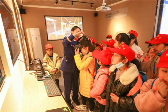 講解員為小記者講述救援設(shè)備的用途及性能,小記者體驗(yàn)個(gè)人防護(hù)裝備等器材。