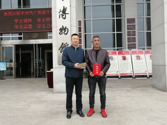 4月25日,周口市博物館收到周口市文昌辦事處李莊社區(qū)村委委員趙團(tuán)結(jié)向捐贈(zèng)的兩件唐代黃釉瓷碗,該文物對(duì)周口漕運(yùn)史具有研究價(jià)值。周建山館長向趙團(tuán)結(jié)頒發(fā)收藏證書,并感謝他對(duì)周口考古工作的支持。