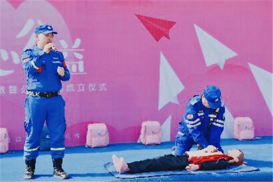 活動現(xiàn)場,藍天救援隊隊長孟坤以多年救援經(jīng)驗,與隊員們互相配合,演示如何正確穿戴救生衣、如何正確實施心肺復(fù)蘇術(shù)等,還生動演繹了當(dāng)學(xué)生遇到有人落水等突發(fā)情況,如何在保證自己不受傷害的情況下實施救援。