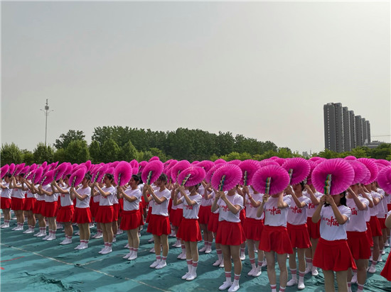 開幕式還舉行了彩扇舞、啦啦操、中國功夫、歌曲等文體表演。其中,彩扇舞《盛世花開》,由該校文化教育學院300名女生手持彩扇,跟隨著不同的音樂節(jié)奏變換著不同的色彩與隊形,依次拼出由鐮刀和錘頭組成的中國共產黨黨徽、象征體育精神的奧運五環(huán)、“慶祝建黨100周年”、“周職20周年校慶”等圖形和字樣,表達著對黨的熱愛和對學校的祝福。表演者王真真說:“大家協(xié)同配合才能把節(jié)目表演好,這個節(jié)目我們排練了一個多月。雖然很辛苦,但是看到節(jié)目順利演出,感到很有成就感?!?/p>