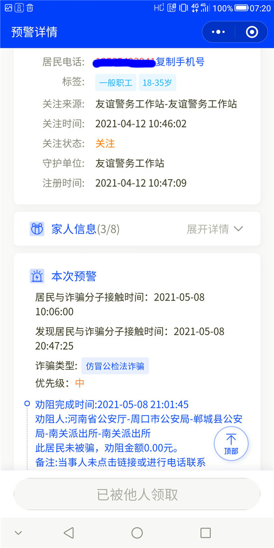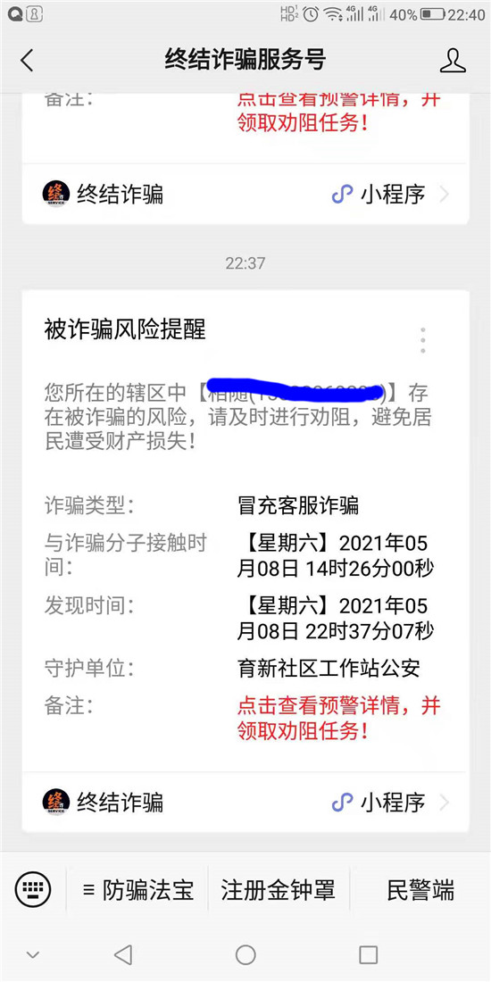 5月8日,鄲城縣公安局南關(guān)派出所社區(qū)民警收到“金鐘罩”推送的反詐預(yù)警信息,轄區(qū)居民郭某有受騙風(fēng)險(xiǎn),社區(qū)民警第一時(shí)間聯(lián)系郭某核實(shí)了解相關(guān)情況并及時(shí)予以制止。